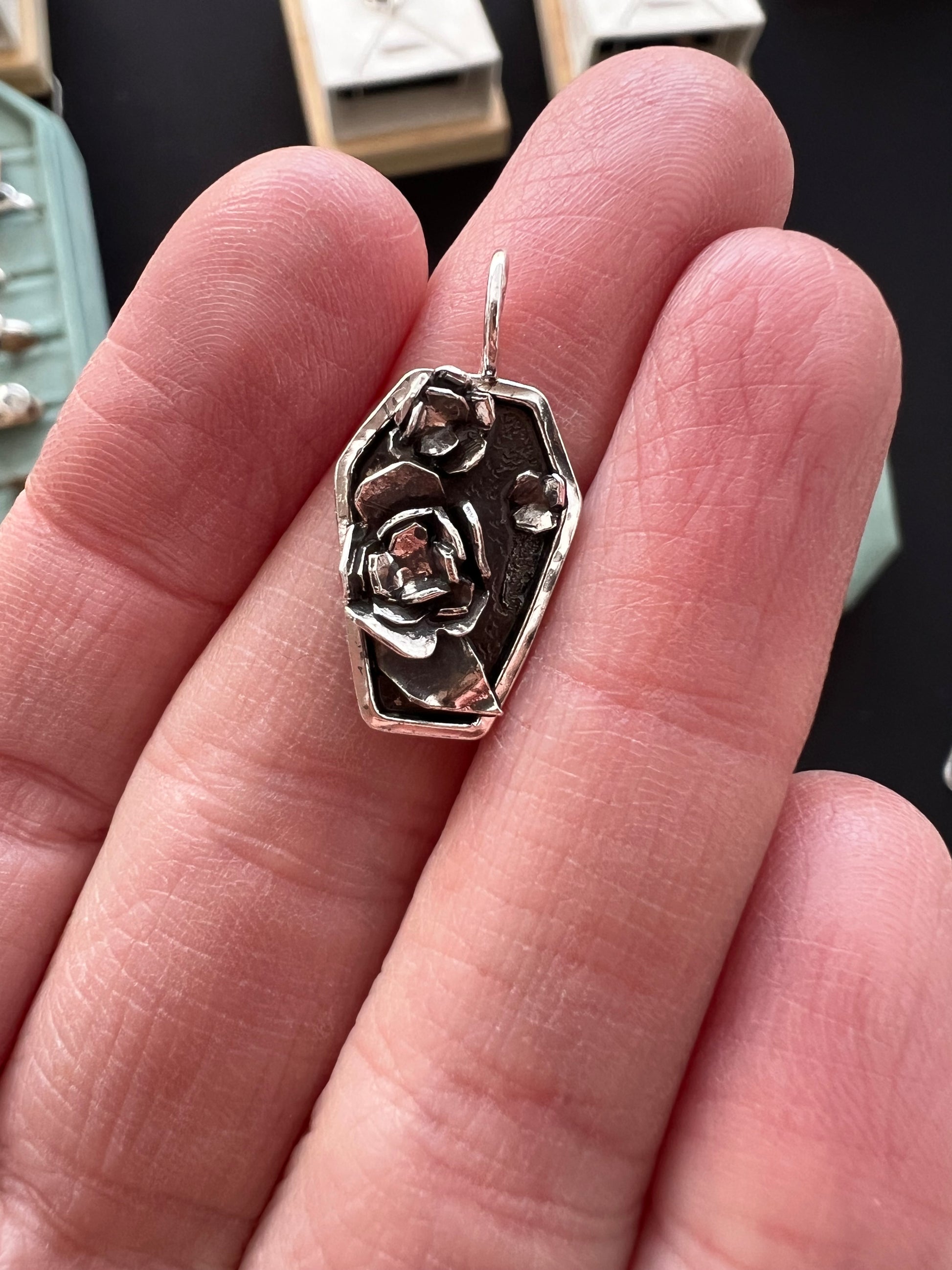 A hand forgedĀ pendant featuring roses on a coffin on a 16ā chain. Please message after if youād like an 18ā or 20ā chain instead