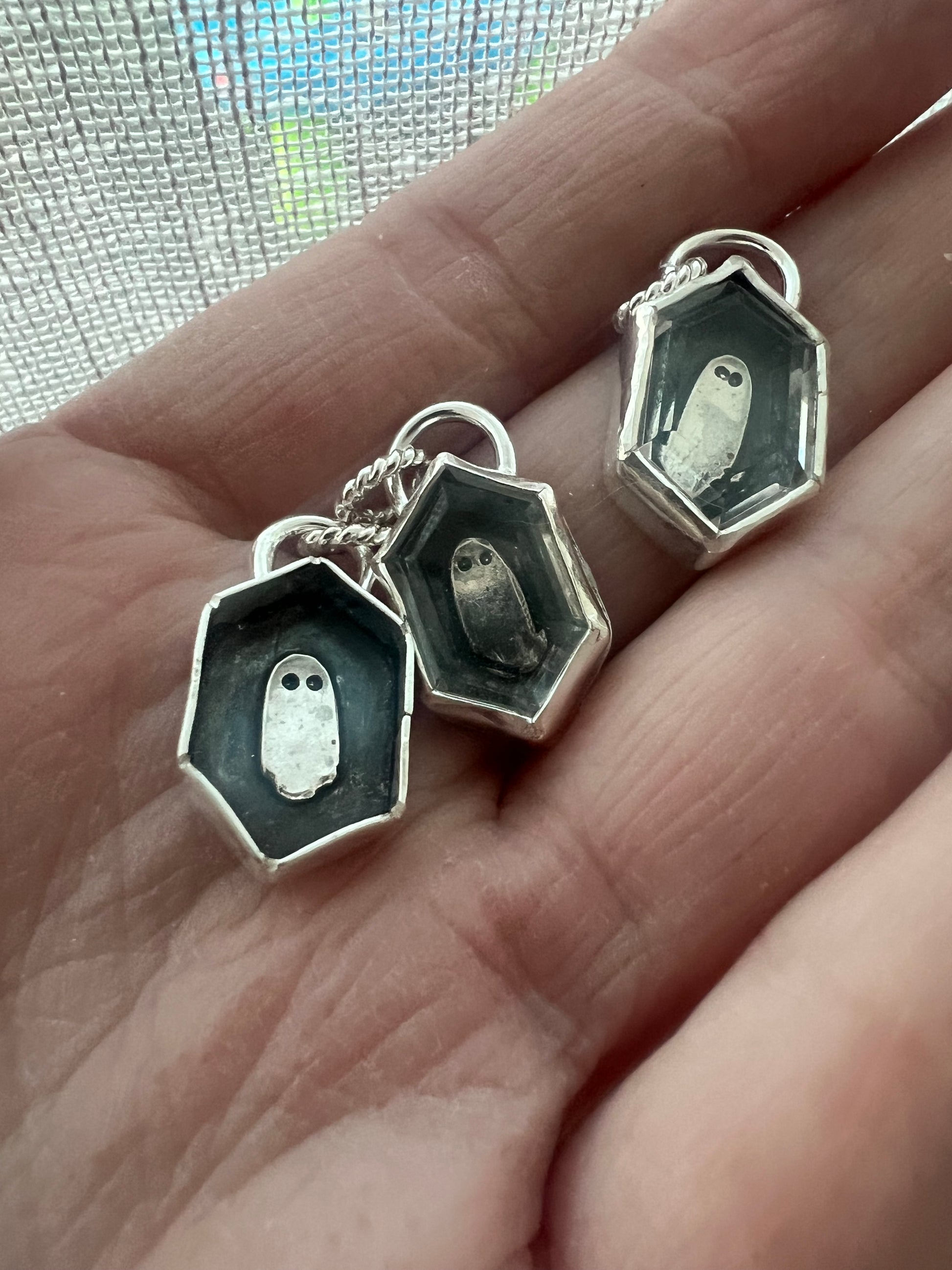 A portrait-cut quartz set on top of a hand-forged backplate with a hand-carved ghost.