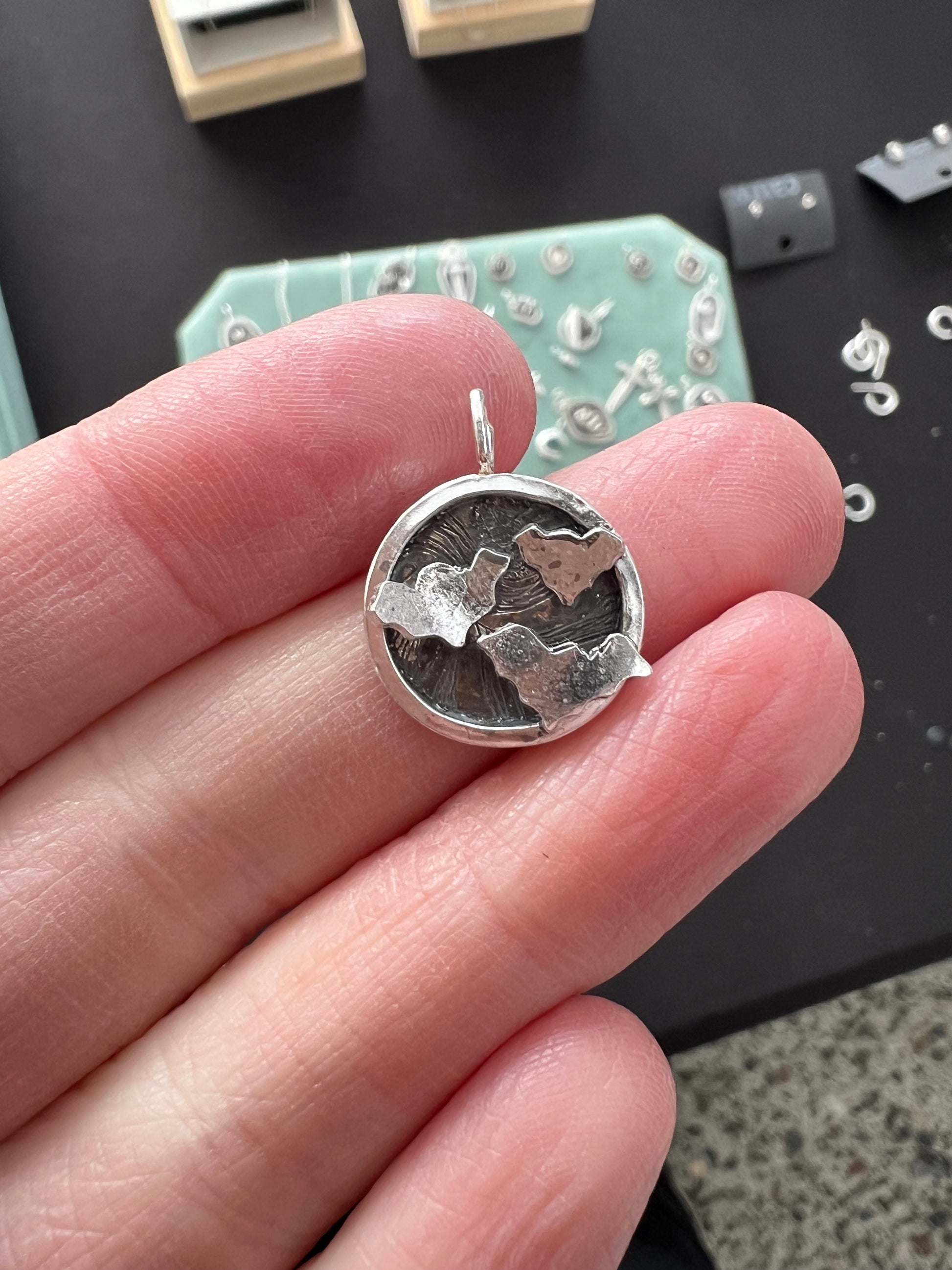 A hand forgedĀ pendant featuring three bats on a 16ā chain. Please message after if youād like an 18ā or 20ā chain instead