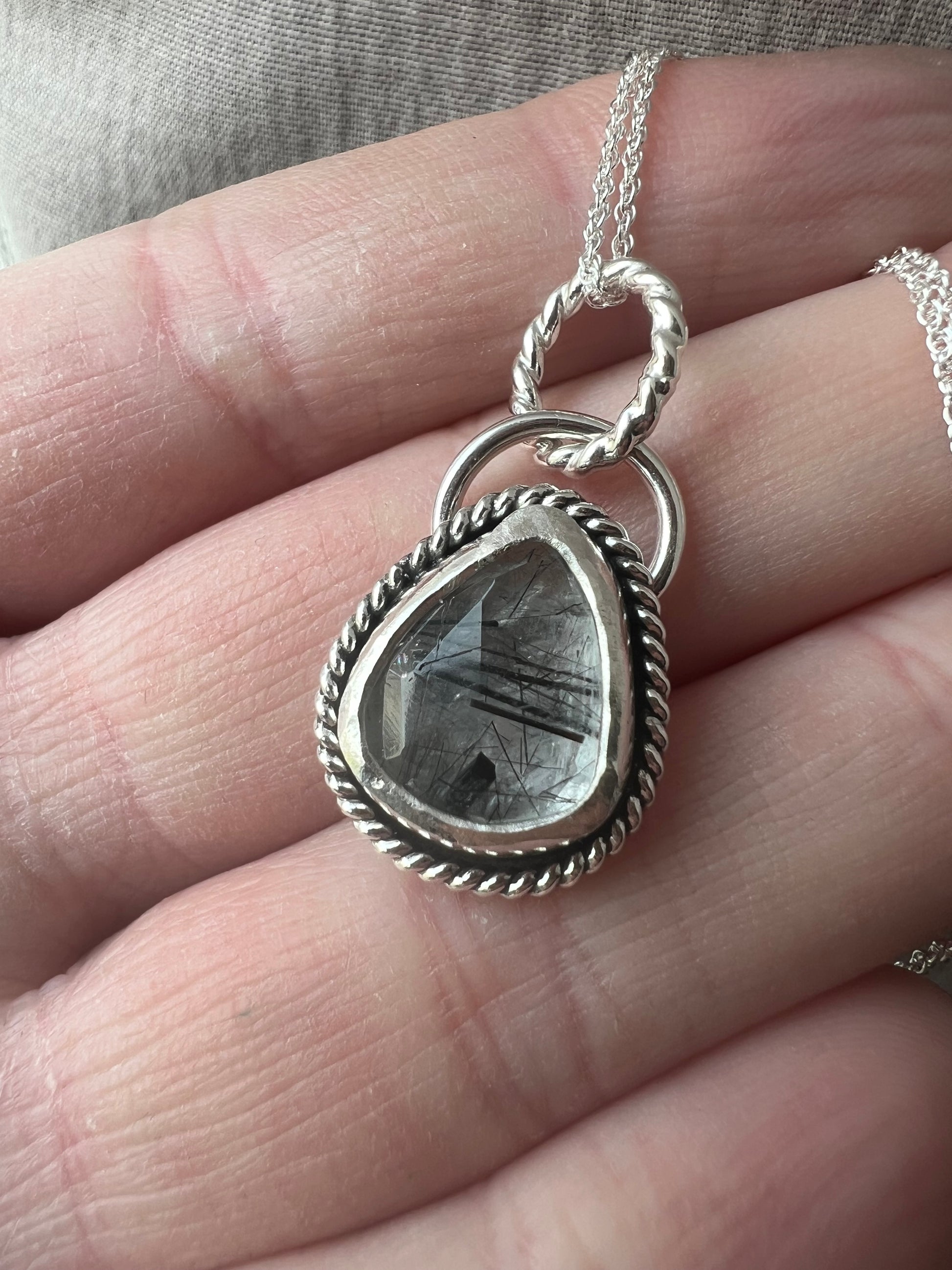 a medium pear freeform tourmalinated quartz is bezel set and accented with a rope style border