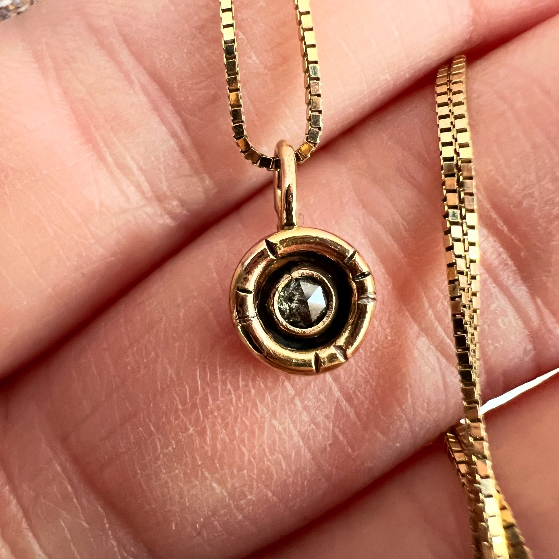 A 3.5mm natural rose cut salt and pepper diamond is bezel-set in solid 14kt gold and surrounded by curved, hand stamped border.